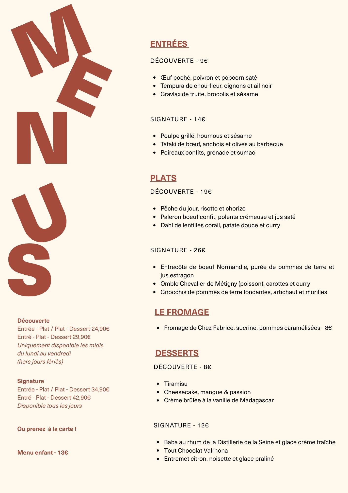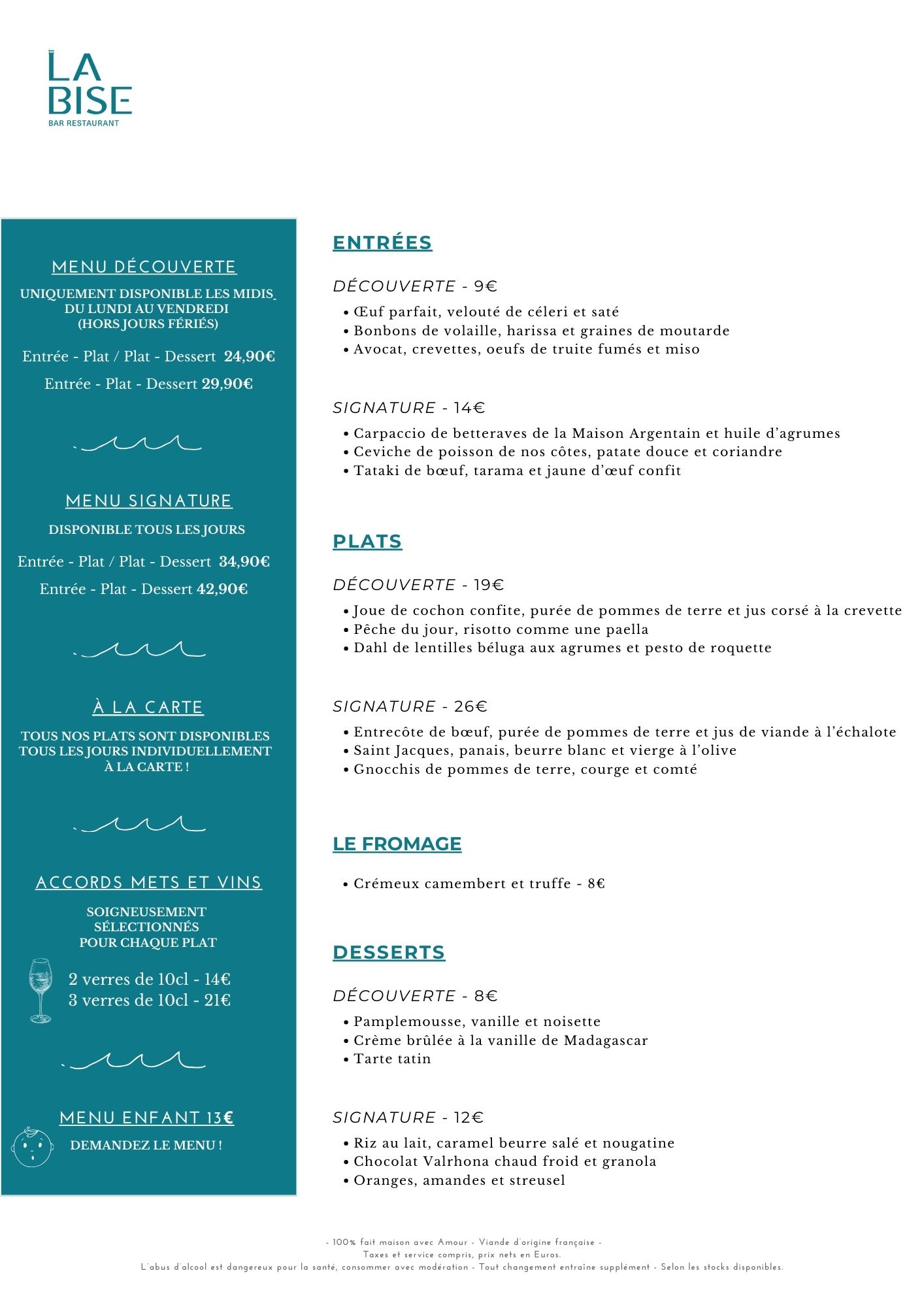 LA CARTE ÉVOLUE RÉGULIÈREMENT SELON LES ENVIES DU CHEF ET DE LA SAISON.